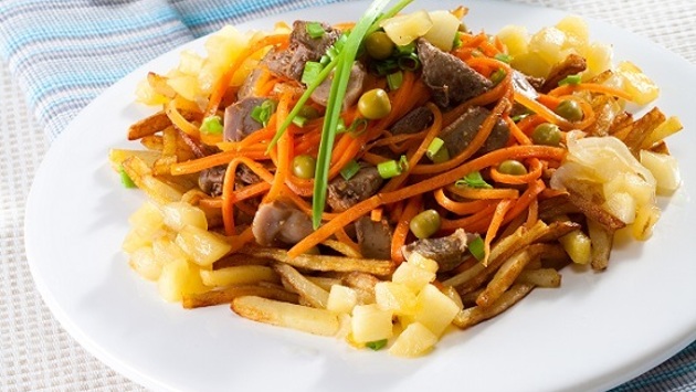 У хорошей хозяйки все идет в дело, ничто не пропадает. Прекрасный тому пример — блюда из субпродуктов. Наверняка и в вашей семье есть почитатели бюджетного мяса. Салаты, закуски, супы, вторые блюда — все можно приготовить, используя потрошка, язык, печенку, сердце и многое другое. Пробуйте и удивляйте! 1. Салат с потрошками Салат с потрошками/Фото: Олег Кулагин/BurdaMedia Салат с потрошками. Фото: Олег Кулагин/BurdaMedia Понадобится: 200 г моркови по-корейски, 300 г куриной печенки, 300 г куриных желудочков, небольшой пучок зеленого лука, 0,5 баночки консервированного зеленого горошка, соевый соус, 1 веточка базилика, растительное масло для обжаривания. А также: 400 г картофеля, 2 красных яблока, 2 ст. ложки винного уксуса, 3 ст. ложки яблочного сока, 1 луковица, соль, молотый черный перец, 2 ч. ложки сахара. Приготовление: Печенку вымыть и откинуть на дуршлаг. Дать воде полностью стечь и выложить печень на бумажное полотенце. Затем нарезать соломкой или кусочками. В сковороде разогреть растительное масло и обжарить в нем печенку (не солить!). Куриные желудочки подготовить: перебрать, снять при необходимости остатки жесткой оболочки, вымыть, откинуть на дуршлаг и выложить на бумажное полотенце, чтобы обсохли. Желудочки отварить в несоленой воде до готовности. Из бульона выложить, остудить и тоже нарезать соломкой. Обжарить в растительном масле отдельно от печенки. Зеленый лук вымыть и обсушить. Нарезать кольцами. Базилик подготовить и порубить. В салатник выложить морковь по-корейски, зеленый лук, печенку, желудочки, базилик, зеленый горошек. Все перемешать и получившийся салат заправить соевым соусом. Приправить солью и перцем по вкусу. Картофель очистить, нарезать брусочками, обсушить бумажным полотенцем и обжарить в растительном масле до золотистой корочки. Посолить. Соус: яблоки подготовить и нарезать брусочками, лук — полукольцами. Все обжарить в масле, приправить сахаром, влить уксус, яблочный сок и посолить. Тушить 15 минут. Салат выложить на блюдо, вокруг разложить картофель и полить его соусом. 2. Фаршированное сердце Фаршированное сердце/Фото: Олег Кулагин/BurdaMedia Фаршированное сердце. Фото: Олег Кулагин/BurdaMedia Понадобится: 4 телячьих сердца, 4 кубика приправы для мяса, 60 г рубленого мяса, 2 разноцветных стручка сладкого перца, 0,5 небольшого кабачка, 1 луковица, 1 баклажан, 1 морковь, 150 мл красного вина, 2 стебля черешкового сельдерея, 1 желток, 2 ст. ложки растительного масла, 1 ломтик белого хлеба, 6 веточек петрушки. Приготовление: Сердца очистить от пленок, сосудов и жира. Петрушку порубить и смешать с рубленым мясом, раскрошенным хлебом и желтком. Сердца нафаршировать, сколоть шпажками и обжарить в растительном масле (8-10 минут). Выложить, накрыть и временно оставить. Лук, сельдерей и морковь мелко нарезать и тушить 5 минут в соке от сердца. Добавить приправу. Кабачок, перец и баклажан нарезать средними кусочками. Лук и морковь залить вином, добавить кабачок, перец, баклажан и довести до кипения. Сердца выложить к овощам и тушить под крышкой 1,5 часа. 3. Говяжий язык по-кавказски с орехами Говяжий язык по-кавказски с орехами/Фото: А. Карпенко/BurdaMedia Понадобится: 1 говяжий язык (2 кг), 600 г грибов, 2 луковицы, 1 ст. ложка сливочного масла, 2 стакана грецких орехов, 2 зубчика чеснока, 2 стакана сметаны, 1 кабачок или цуккини, зелень петрушки. Приготовление: Язык вымыть, варить в 