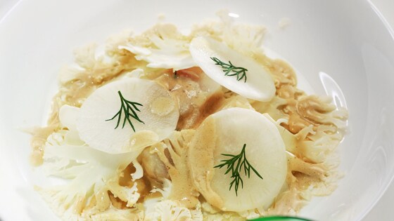 Филе трески: 1 кгДайкон: 300 гЦветная капуста: 300 гСливочное масло: 100 гУкроп: 20 гИкра трески: 50 гБульон: 500 млЛук-шалот: 2 штукиЧеснок: 2 зубчикаСливки 35%-ные: 100 млСоль: по вкусуПерец черный молотый: по вкусуБелое сухое вино: 100 мл Инструкция приготовления Мелко нарезать лук-шалот и чеснок и слегка обжарить их в небольшом количестве сливочного масла (примерно 10 г), добавить белое вино и варить на быстром огне, пока вино не выпарится примерно наполовину.Добавить куриный, рыбный или овощной бульон, довести до кипения и варить в нем куски филе трески в течение семи минут. Достать рыбу, положить в теплое место, бульон процедить, добавить сливки и варить, пока не загустеет. Тогда вмешать в него икру, посолить и поперчить, если надо.На мандолине или ножом нарезать тонкими ломтиками редьку и цветную капусту. В тарелку выложить рыбу, сверху капусту и редьку, полить соусом и украсить укропом.