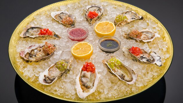 В меню несколько видов дальневосточных, европейских и японских устриц, которые доставляются в термобоксах на льду, сервированные лимоном, бородинскими гренками и несколькими соусами в открытом виде на выбор, то есть максимально приближенно к ресторанной подаче.
