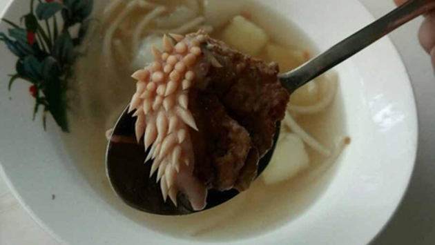Ученики средней школы в поселке Юргамыш Курганской области обнаружили в одной из тарелок с школьным супом странного вида кусок мяса с белыми отростками, похожими на щупальца или личинки насекомого. Фотографию опубликовали в группе «Инцидент Курган» во «ВКонтакте».