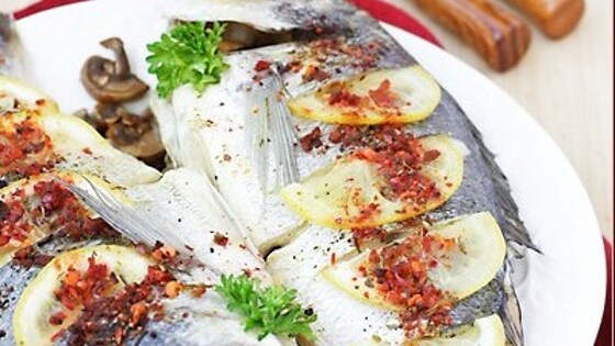 Ингредиенты Дорадо: 2 штукиЛук репчатый: 1 штукаСвежие шампиньоны: 300 гСоевый соус: 4 столовые ложкиЛимон: 1 штукаСоль: 1 чайная ложкаПерец черный молотый: щепоткаМолотый красный перец: щепоткаСумах: щепоткаМолотый кориандр : щепоткаМайоран: щепоткаСушеный базилик: щепотка Инструкция приготовления Дораду очистить, избавить от внутренностей, натереть солью, поперчить, сбрызнуть соком лимона и оставить мариноваться на 15 минут.Для начинки грибы нарезать тонкими ломтиками. Лук нарезать кубиками. На соевом соусе обжарить лук с грибами. Посолить.Лимон нарезать тонкими кружками, каждый кружок порезать пополам.На рыбе сделать острым ножом надрезы, вставить в них половинки кружков лимона.Внутрь тушки вложить начинку, готовую рыбу выложить на решетку пароварки, сверху присыпать смесью специй и готовить 20–25 минут.