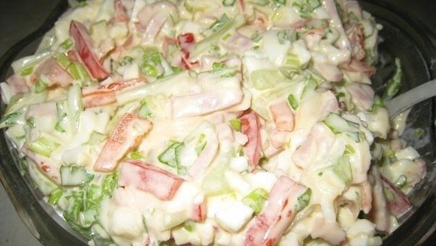 Энергетическая ценность на порцию Калорийность – 64 Ккал, белки – 4,7 г, жиры – 3,3 г, углеводы – 3,5 г. Ингредиенты Яйцо куриное: 2 штукиСладкий перец: 1 штукаВетчина: по вкусуСыр: по вкусуМайонез: по вкусуЗелень: по вкусуОгурцы: 2 штуки Инструкция приготовления Ветчину, яйца, перец, огурец нарезать небольшими кубиками, сыр натереть на крупной терке, зелень измельчить.Смешать, заправить майонезом.