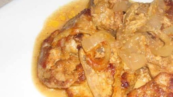 Порций: 2, время: 1 час Энергетическая ценность на порцию Калорийность – 830 Ккал, белки – 54,6 г, жиры – 62,8 г, углеводы – 15,4 г. Ингредиенты Свинина: 500 гМайонез: 125 гДижонская горчица: 50 гЛук: 2 головкиСоль: по вкусуПерец черный молотый: по вкусу Инструкция приготовления Мясо нарезаем на порционные куски и слегка отбиваем, лук режем полукольцами.Готовим маринад: смешиваем майонез, горчицу, соль и перец. Затем мясо кладем в маринад и перемешиваем.Выкладываем в кастрюльку слои мяса, чередуя их с луком. Оставляем на ночь.После того, как мясо отстоялось, быстро обжариваем его на горячей сковороде с двух сторон.Берем горшочек, на дно кладем немного лука, на лук — мясо. Сверху мясо можно еще раз прикрыть слоем лука.Запекаем в нагретой до 200 градусов духовке 40-45 минут. Поделиться