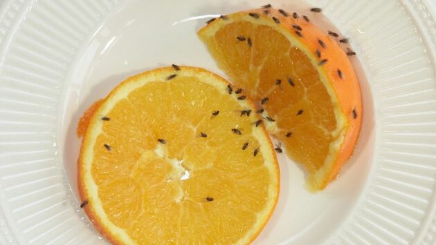 Откуда берутся мошки Плодовые или фруктовые мошки – это мухи-дрозофилы. Они часто мучают людей, появляясь на остатках еды, в стоках раковин и на свежих продуктах. Они, конечно же, не материализуются из ниоткуда. Объяснение довольно простое: мошки появляются на кухне, когда имеющиеся в ней овощи или фрукты начинают портиться. Дело в том, что дрозофилы после спаривания откладывают яйца на многих продуктах, которые есть в доме в открытом доступе, и невидимые для людей личинки ждут благоприятных условий. Всё, что нужно для их дальнейшего развития – начавшийся процесс гниения или брожения. В этот момент мошки активизируются и захватывают территорию фрукта, а затем и всего дома. Чтобы избежать неприятного соседства, овощи и фрукты следует хранить в холодильнике, а перед едой мыть их тёплой водой. Как избавиться от непрошеных гостей Дрозофилы – опасные насекомые, поэтому от них всегда следует избавляться. Как минимум, потому, что они портят продукты питания, как максимум, являются переносчиками разнообразных инфекций. Как же выпроводить неприятных соседей? Во-первых, нужно найти источник их появления: методично проверить все полки, где хранятся продукты, а также сток в раковине, так как там могут храниться остатки пищи. Мошки также могут появиться и в увядающих цветочных букетах. Во-вторых, выбросить из дома все найденные источники. После этих процедур в доме останутся только неактивные представители насекомых, затаившиеся в укромных местах. Чтобы избавиться и от них, лучших способ – потравить их дихлофосом. Но не всегда такой вариант возможен, поэтому есть другой: сделать ловушку. На дно банки или другой ёмкости положить кусок фрукта, а отверстие закрыть воронкой из бумаги. Кончик воронки нужно срезать, чтобы мошки могли залетать в банку. В итоге внутрь они будут попадать беспроблемно, а выбраться уже не смогут. А у вас есть проверенные способы избавления от плодовых мошек?