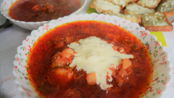 Друзья мои! Всё пироги, да пироги — пора уже поесть и супчику. Например, красный борщ чем плох?! Сейчас самое время его готовить — слава богу, в огороде всё наросло. Ну, конечно, главный овощ в борще — это свёкла. Не хочу претендовать на название украинский борщ, так как он адаптирован под мой вкус. Рецептов борща существует множество. И даже я готовлю борщ всегда по-разному, так как общепринятые стереотипы для меня всегда на последнем месте, а на первом месте — её величество ИМПРОВИЗАЦИЯ. Сегодня я представлю на ваш суд один из вариантов моего борща. Очень надеюсь, что и вам пригодится мой рецепт! Количество необходимых продуктов указано вот для такой 3-х литровой кастрюли. Кастрюля для борща Ингредиенты для борща свинина на косточке — 500 г свёкла — 400 г картофель — 2 больших шт. репчатый лук — 2 средних головки чеснок — 2 дольки помидоры - 5-6 шт. морковь - 2 шт. капуста — 300 г болгарский перец — 1-2 шт. рис (перловка) — 2 ст.л. подсолнечное масло для зажарки — 3 ст. ложки перец чили, чёрный перец — по вкусу лавровый лист — 2 листа зелень — 60 г соль — 1 ст. ложка сахар — 1 ч. ложка без горки лимонная кислота — 0,5 ч. ложки для гренок хлеб — по потребности чеснок — 2-3 дольки майонез — 3 ст. ложки Приготовление: Для начала возьмём свиную косточку с мясом и порежем её при необходимости. Свинину можно заменить на говядину, баранину, курицу — кто как любит. Я люблю свиные косточки (особенно подходят сюда свиные рульки). Положим мясо в кастрюлю в холодную воду. После этого поставим её на огонь. Свинина Дальше режем репчатый лук и натираем на тёрке морковь. Ставим их обжаривать на небольшой огонь. Трём морковь Жарим лук Добавляем морковь Режем мелко помидоры, предварительно сняв с них кожицу. Отправляем их тоже на сковороду. Добавляем помидоры Дальше нужно добавить натёртую сырую свёклу. Но перед этим нужно в сковороду положить 1/4 ч. ложки лимонной кислоты. Это делается для того, чтобы свёкла сохранила свой цвет. Свёкла Лимонная кислота Добавляем свёклу в сковороду Убавляем огонь. Закрываем сковороду крышкой и оставляем всё тушиться. А в это время быстро режем соломкой картофель, капусту и болгарский перец. Картофель Режем соломкой капусту Нарезаем болгарский перец В то же время не забываем снять накипь на бульоне. Снимаем накипь После закипания бульона через 15-20 минут добавляем в бульон картофель, капусту и болгарский перец. добавляем овощи в бульон. После того, как бульон снова закипит, нужно добавить специи, соль и сахар. Специи Специи Добавляем в бульон немного риса или перловки. Варим бульон ещё 25-30 минут. В это время займёмся гренками. Поджарим кусочки хлеба на растительном масле с обеих сторон. Дальше намажем на них такой соус: майонез + измельчённый чеснок + укроп. Соус для тостов Чесночные гренки Через полчаса возвращаемся к бульону. Добавляем в него измельчённый чеснок и лавровый лист. Чеснок Варим борщ ещё 10 минут. Затем добавляем зелень и тушёные на сковороде овощи. Но перед этим обязательно добавим в борщ ещё 1/4 ч.ложки лимонной кислоты. Добавляем зелень. Добавляем овощи Доводим всё до кипения и выключаем газ. БОРЩ ГОТОВ! Очень вкусно! Борщ получился очень наваристый и очень вкусный. Обязательно подаём к столу с чесночными гренками и сметаной!