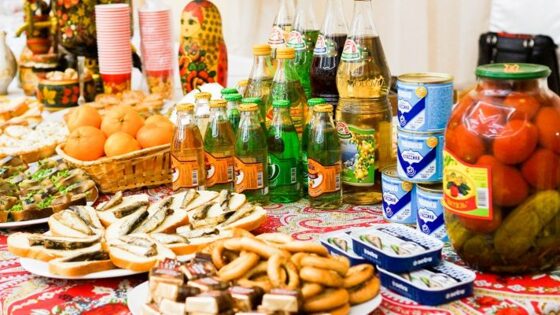 Люди советской закалки очень трепетно относились к подготовке праздника, ведь в этом есть что-то по-настоящему волшебное. В то время очень сложно было достать такие продукты, как колбаса и сельдь, что уже говорить о шампанском, которое было неизменной традицией всех празднующих. Почему-то люди не думали о разнообразии, все блюда повторялись из года в год, приобретая статус традиции. Рассмотрим самые популярные блюда, которые готовили на Новый год в советском союзе. Запеченная курица в духовке Это блюдо считалось основой любого стола времен СССР. Запекали курицу по специальному рецепту, благодаря которому она обретала золотистую, хрустящую корочку. Подавали блюдо с картофелем на гарнир. У многих эта самая курица ассоциируется со вкусом детства. Оливье Продукты на этот салат было достать крайне сложно, но советские люди преуспевали и в этом. В оригинальную версию салата того времени входит вареная колбаса, картошка и морковь, а также соленый огурец и консервированный горох. Ингредиенты режутся средними кубиками и заправляются майонезом. Мимоза Этот салат имеет специфический вкус, но от этого не становится менее интересным. В его состав входит сайра в масле, варенный картофель, морковь и сырой репчатый лук. Сверху готовый салат в обязательном порядке посыпается тертым яичным желтком и украшается веточкой укропа или петрушки. Шпроты Бутерброды со шпротами были альтернативой бутербродов с икрой. Для их приготовления нужен был черный хлеб и сливочное масло. Шпроты съедались с хвостиками и масло из банки не пропадало – его под конец пиршества вымакивали из банки черным хлебом. Сырокопченая колбаса Колбаса, а тем более сырокопченая, была настоящем деликатесом у празднующих. Позволить себе это мог далеко не каждый советский гражданин, а кому повезло, тому продавщица в магазине бережно заворачивала палку колбасы в коричневую бумагу. Холодец Это блюдо представляет собой мясо, покрытое слоем желеобразного бульона. Украшался холодец цветочками из отварной моркови. Подавался с хлебом, хреном или картофелем. Селедка под шубой Этот салат любили готовить с добавлением яблока. Сельдь покупали непосредственно перед праздником, чисткой от косточек мало кто заморачивался. Маленькие косточки либо проглатывали вместе с салатом, либо сплевывали. Мандарины Стеклянная ваза с мандаринами – атрибут любого советского стола. Дети наедались ими до высыпаний, взрослые закусывали цитрусовыми крепкие напитки. Иногда мандарины использовали для приготовления желе, но такое бывало крайне редко. Все любили вкус мандарин, которые появлялись только на новогодние праздники.