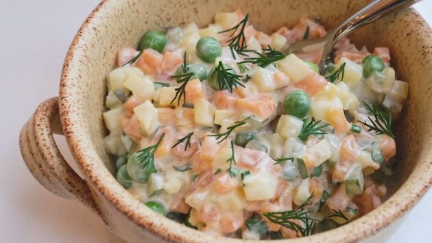Новый год уже совсем близко. В каждом доме скоро начнутся приготовления к этому главному празднику. Предлагаем удивить гостей и приготовить оливье для вегетарианцев. В составе салата не будет мяса, но вы этого сразу не заметите. Да и готовится он намного проще. Что найти в холодильнике? Картофель; морковь; горошек зеленый; огурцы; сметана или майонез (легкий); тофу; зелень (любая). Как готовить? Этап 1 — нужно приготовить наши овощи. Картофель и морковь обычно закидывают в пароварку. При таком способе приготовления они сохраняют больше полезных свойств. Если у вас ее нет, то можно просто отварить. После того, как они будут готовы. Дайте им остыть, а потом приступайте к нарезанию. Этап 2 — огурцы не обязательно должны быть маринованными. Покупайте любые. Все зависит от ваших вкусов. Его тоже нужно нарезать на кубики. Этап 3 — тофу также нарежьте на кубики. Этап 4 — объедините все нарезанные составляющие: картофель, морковь, тофу, огурец. Добавьте к ним горох консервированный и заправьте выбранным соусом. Поперчите и посолите. Для украшения добавьте немного зелени.