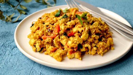 Завтрак — это важный прием пищи. Именно он обеспечивает нас энергией в течение дня. Можно приготовить любимый омлет, сырники, овсяную кашу, тосты или бутерброды. А можно приготовить что-то новое и интересное. К такому новому относится скрэмбл из тофу. Что купить в магазине? - тофу (300-400 гр); - помидоры (1-2 шт); - лук (1 шт); - куркума (щепотка); – карри (щепотка) - тимьян, соль и перец. Начинаем процесс. Шаг 1 — первым делом нарежьте лук. Нарезайте его мелко, чтобы он не чувствовался в блюде. Шаг 2 — теперь лук отправьте обжариваться на масле. Выбирайте любое масло. Это может быть обычное растительное или оливковое. Шаг 3 — если тофу у вас в брикете, то измельчите его на мелкие кусочки. Если вы купили мягкий тофу, то ничего с ним делать не надо. Теперь к обжаренному луку отправьте тофу, карри и куркуму. Именно эти две специи подарят блюду желтый цвет. Потушите все вместе пару минут. Шаг 4 — нарезанные мелко помидоры тоже отправьте к скрэмблу. Готовьте все до смягчения помидоров, не забыв добавить соль, перец и тимьян.