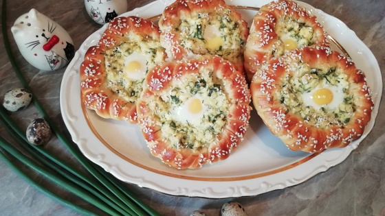 Сегодня рассказ и рецепт хитрой ватрушки, которая решила притвориться хачапури. Вкуснейшее сочетание сладковатого теста и солененькой начинки с ароматом зелени. Ингредиенты Тесто Мука — 450 г Кефир — 210 мл Яйцо — 1 шт. Соль — 1 ч. ложка Сахар — 3 ст. ложки Дрожжи — 2 ч. ложки Начинка Брынза — 400 г Зелень (лук и укроп) Перепелиные яйца — 20 шт. (10 шт. в начинку, 10 шт. на украшение ватрушек) Сметана — 1 ст. ложка Соль — если сыр не очень соленый Дополнительно Яйцо для смазывания ватрушек Кунжут для украшения Время приготовления — примерно 3 часа (1,5-2 часа на подъем теста + 40 минут на формовку ватрушек + 40 минут на выпечку). Приготовление Тесто я замешиваю в хлебопечке. Уже давно перешла на этот ленивый способ приготовления теста и очень довольна результатом. Если же дома нет такого прибора, то без проблем тесто замешивается руками. Закладываем в чашу хлебопечки все ингредиенты и отправляем трудиться на режиме «Дрожжевое тесто». Тесто подошло. Быстренько подготовим начинку. Потрем брынзу на тёрке. Добавим мелко порезанные укроп и лук, сметану и перепелиные яйца. Все перемешаем. Тесто разделим на 10 частей. Каждую раскатаем в кружок. Сделаем надрезы солнышком и сплетем корзиночку. Выложим наши будущие ватрушки на противень, застеленный бумагой для выпечки. В каждую добавим по столовой ложке начинки. Накроем полотенцем и оставим минут на 15-20, пусть подойдут. Затем смажем краешки взбитым яйцом и посыплем кунжутом. Выпекать будем при температуре 190°С 30 минут. Затем достанем наши ватрушки из духовки, чайной ложкой сделаем в начинке небольшое углубление и выложим перепелиное яйцо. Снова отправим ватрушки в духовку минут на 5-7. Вот и готовы наши хитрые вкусняшки, которые можно назвать и ватрушками по мотивам хачапури, и хачапури на русский лад. Но как не назови — результат отличный: вкуснейшая ароматная выпечка уже собрала за столом всю семью. Пора пробу снимать. И вам приятного аппетита, дорогие семидачники!
