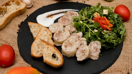 Традиционно джерме подают к столу целиком на одном блюде с другим мясом, а также с отварным картофелем, хлебом и соусами. Есть их нужно горячими, обмакивая в пряный тузлук. Поскольку наш герой профессиональный повар, он делает современную подачу.