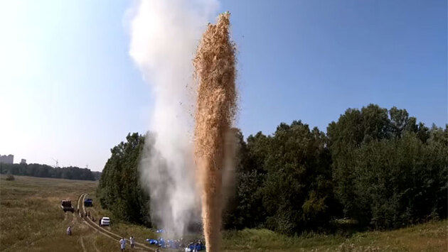 На кадрах видно, как после заправки бочки кока-колой туда поместили соду. В итоге к небу взмыл огромный пенный фонтан высотой десятки метров, заливший все вокруг.
