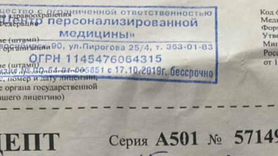 Отказ провизор объяснила тем, что в рецепте есть ошибка – не полностью заполнен адрес в штампе частной клиники ООО «Центр персонализированной медицины». Почтовый адрес на рецепте указан, а вот индекс напечатан не полностью – «Новосибирск 90».