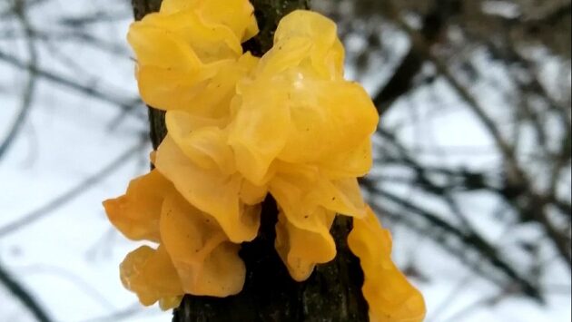Среди грибов встречаются всем известные, такие как свинухи, и более экзотические. Например, дрожалка оранжевая – желтый желеобразный гриб, растет на дереве. Знатоки не пройдут мимо него и обязательно положат в корзинку. – Дрожалка оранжевая гриб тоже съедобный и полезный, но редко встречается у нас, – поделилась Любовь Родивилова. Кстати, в Китае дрожалка оранжевая считается деликатесом, а вот в России практически не используется. Фото: Любовь Родивилова