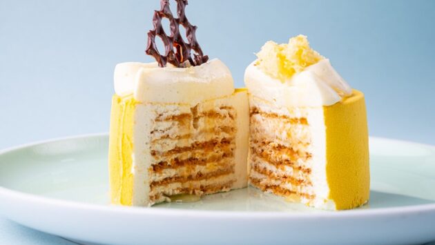 Авторский медовик от первоклассного шеф-кондитера Марины Соловьевой. Готовится на медовом бисквите из фермерских сметаны и сливок, твилем из кунжута и облепиховым соусом.