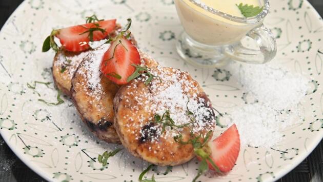 Если думаете, что у вас нет времени вкусно позавтракать, то программа «Бодрое утро» на телеканале «Кухня ТВ» точно для вас! Специально для читателей Eva.Ru ведущий проекта, шеф-повар Кирилл Голиков делится рецептами для отличного начала дня. СЫРНИКИ С ЧЕРНИКОЙ И СОУСОМ КРЕМ АНГЛЕЗ Ингредиенты: ✔️250 г творога 9% ✔️250 мл сливок 33% ✔️250 мл молока ✔️20 г муки ✔️20 г мороженной черники ✔️3 яйца ✔️1 стручок ванили ✔️микрозелень для декора ✔️1 ст. л. растительного масла ✔️1 ч. л. сливочного масла ✔️сахар ✔️сахарная пудра для декора Процесс приготовления: 1. Чтобы удалить лишнюю влагу из творога, процедите его при помощи марли. Отжатый творог выложите в глубокую миску. Добавьте муку, перемешайте. Следом добавьте яйцо и сахар и снова перемешайте до однородности. Выложите в творог сильно мороженную чернику, аккуратно перемешайте. 2. Доску или рабочую поверхность посыпьте мукой, слегка припылите мукой руки. Возьмите небольшое количество творога (примерно 50 г), выложите на поверхность, хорошо обваляйте в муке и сформируйте шарик, а затем слегка расплюсните его ножом по форме сырника (диаметр сырника должен быть примерно 3-4 см, а высота — около 1 см). Отложите сырник в сторону и повторите то же самое с оставшимся творогом. 3. Разогрейте сковороду с растительным и сливочным маслом на плите. Дождитесь, пока масла перемешаются, а затем выложите сырники. Обжаривайте на среднем огне с двух сторон до готовности. 4. Приготовьте крем англез. Сливки влейте в кастрюлю, поставьте на огонь. Добавьте молоко и семена ванили. Доведите до кипения. В отдельной емкости взбейте два яичных желтка с добавлением сахара. Постепенно влейте к желткам кипящую молочную смесь, не переставая помешивать. Процедите полученный соус через сито в кастрюлю, в которой нагревалось молоко. Прогрейте соус на огне до температуры 80 градусов, постоянно помешивая. Затем сразу же перелейте в холодную посуду, поставленную на лед, и хорошо промешайте венчиком. 5. Подавайте сырники с соусом, посыпав сахарной пудрой и украсив микрозеленью. ОМЛЕТ С ОВОЩАМИ И СЫРНОЙ КОРОЧКОЙ Ингредиенты: ✔️3 яйца ✔️20 мл молока ✔️30 г шампиньонов ✔️1 помидор ✔️1 лук ✔️50 г сыр (гауда или пармезан) ✔️зелень по вкусу ✔️растительное и сливочное масло для жарки Процесс приготовления: 1. Шампиньоны зачистите от верхней кожицы. Срежьте нижнюю юбочку и ножки. Затем нарежьте грибы кубиком. Лук также нарежьте мелким кубиком. 2. Разогрейте сковороду с растительным и небольшим количеством сливочного масла. Выложите лук, быстро обжарьте на сильном огне. Как только лук обжарится до золотистой корочки, добавьте шампиньоны. Обжаривайте, пока шампиньоны не станут золотистыми. 3. Томат разрежьте на четыре части, удалите сердцевину и водянистую мякоть. Нарежьте кубиком и выложите в сковороду к шампиньонам. По желанию добавьте зелень. Перемешайте и обжарьте все ингредиенты вместе, затем снимите с огня. 4. Яйца вылейте в чашу блендера. Добавьте молоко и соль. Взбейте блендером в пышную пену 5. К овощам и грибам в сковороде влейте взбитую смесь и отправьте на огонь. Сверху посыпьте омлет тертым сыром. Как только омлет «схватится», снимите его с огня и отправьте в разогретую до 190 градусов духовку на 10 минут. Готовый омлет аккуратно переложите на тарелку для подачи. Украсьте зеленью по желанию. ТВОРОЖНЫЕ СНЕЖКИ С МАНГО-СОУСОМ Ингред