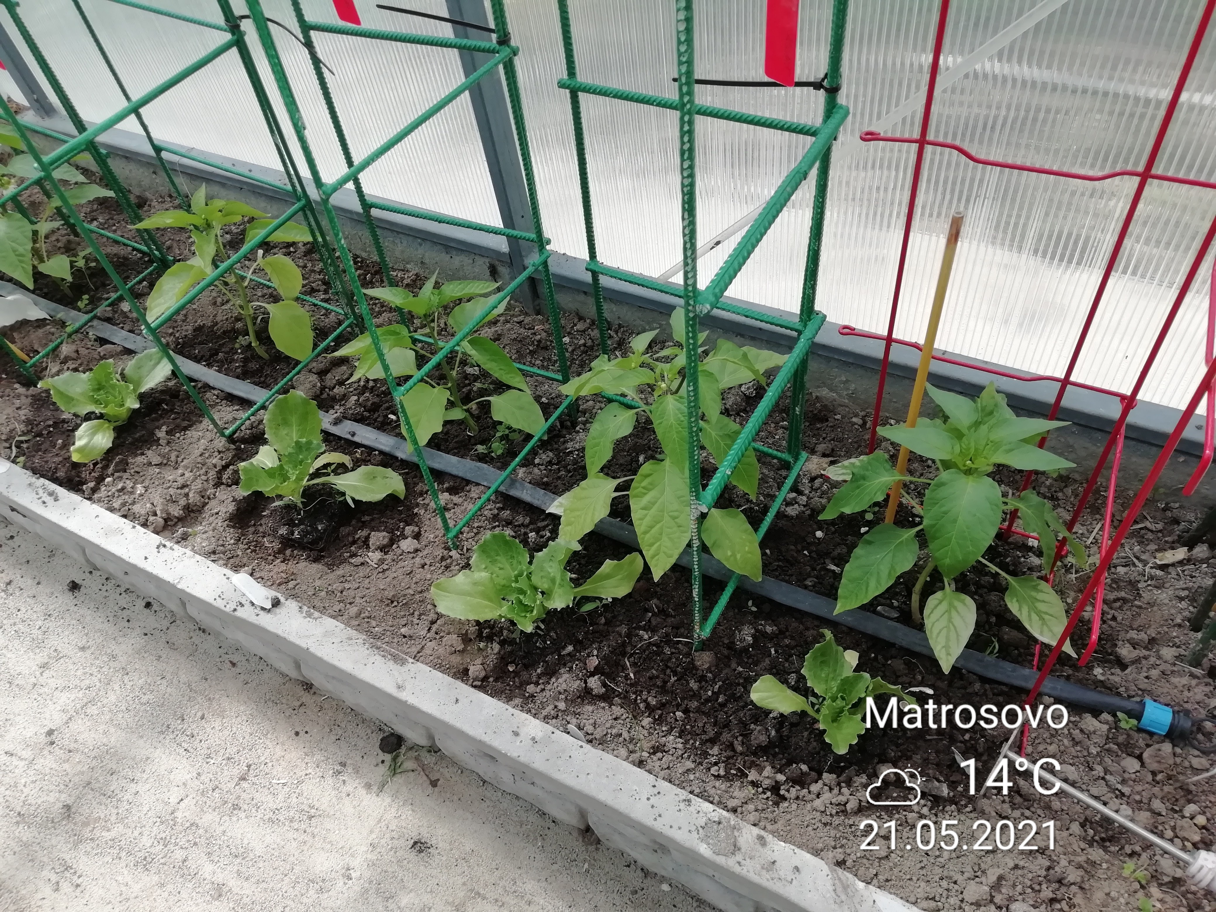 А ровно через месяц все четыре кустика моего салата переехали на грядку в теплице, в ножки к перцам.