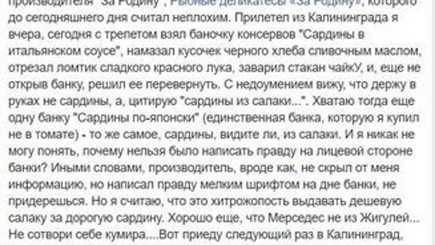 «С недоумением вижу, что держу в руках не сардины, а, цитирую «сардины из салаки...». Хватаю тогда ещё одну банку «Сардины по-японски» (единственная банка, которую я купил не в томате) — то же самое, сардины, видите ли, из салаки. И я никак не могу понять, почему нельзя было написать правду на лицевой стороне банки? Иными словами, производитель, вроде как, не скрыл от меня информацию», — написал телеведущий.