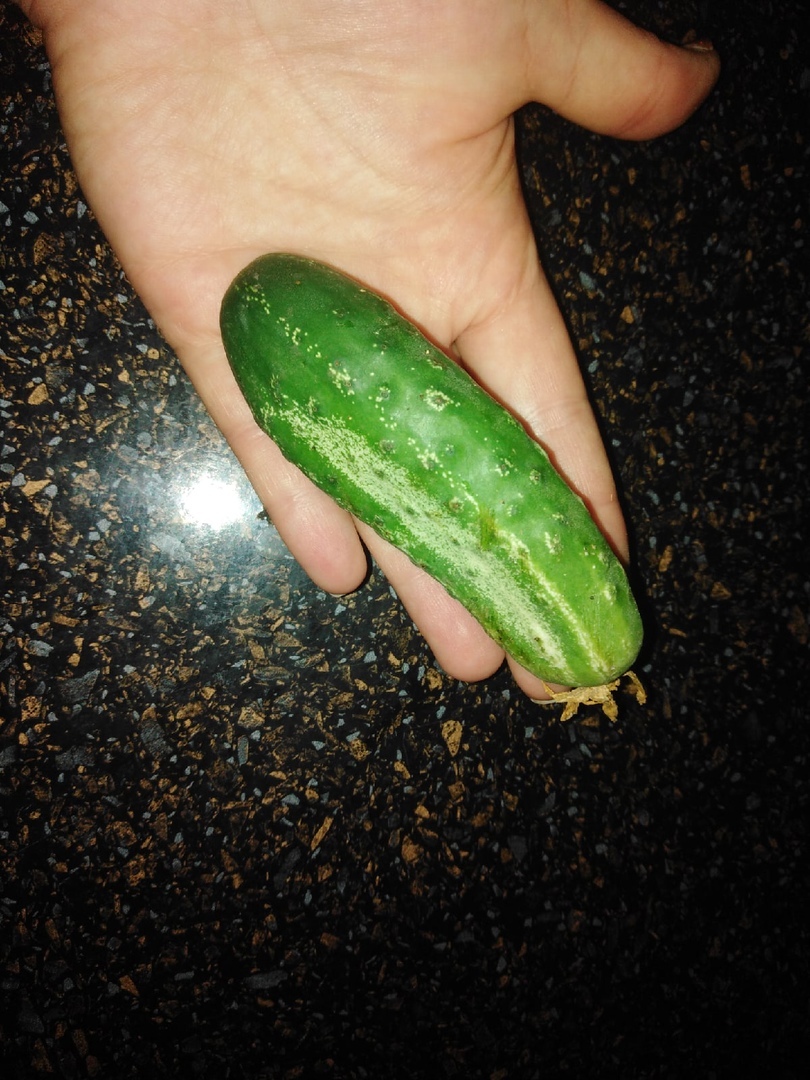 Первый полноценный плод огурца 'Кустик-хрустик' был снят 10 июля. Огурчик вырос красивый, а на вкус хрустящий и без горечи.
