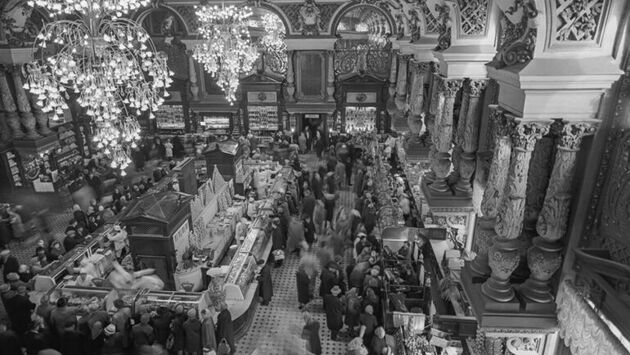 «Магазин Елисеева и погреба русских и иностранных вин» открыли в начале 1901 года. Кроме вина там можно было купить устриц, икру, оливковое масло, французские трюфели, множество сортов чая и кофе, другие заморские и отечественные продукты, а также пирожные, которые пекли в отдельном цехе магазина.