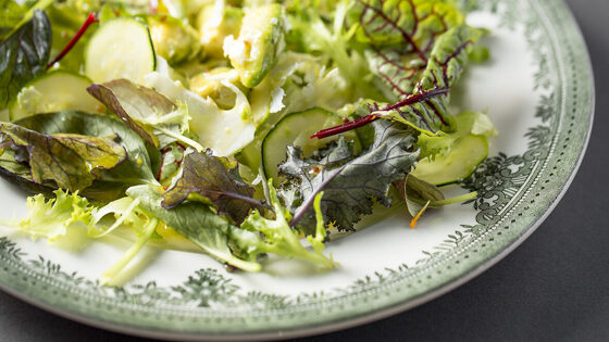 Зеленый салат с огурцом, авокадо, цукини и цветной капустой с горчичным дрессингом, спелые помидоры со сладким красным луком, микс сезонных овощей с душистой зеленью базилика, мяты и кинзы – сочное начало борьбы с авитаминозом.