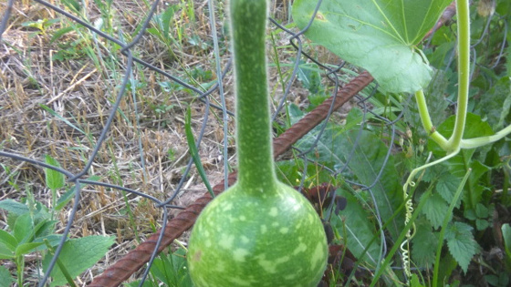 Лагенарию направляла вдоль забора из сетки рабицы, выращивала чисто для эстетического удовольствия: очень забавно выглядела эта лиана со свисающими тыковками, а вечером её украшали довольно крупные граммофончики белых цветков с нежным запахом.