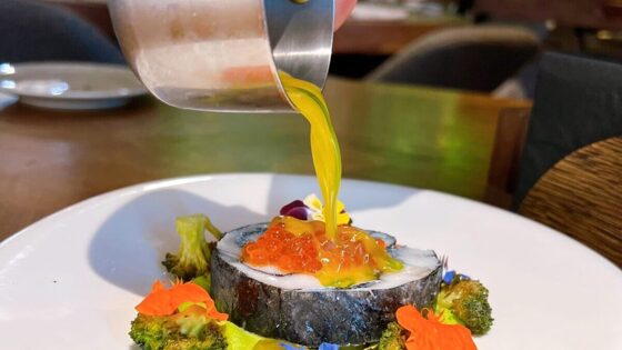 Другой специалитет — сладковатый карпаччо из гребешка с клубникой, маринованной в кимчи, и базиликовым айоли. Воедино композицию связывает нектар из томатов с шисо, а «вишенкой» композиции является икра палтуса в чернилах карактицы.