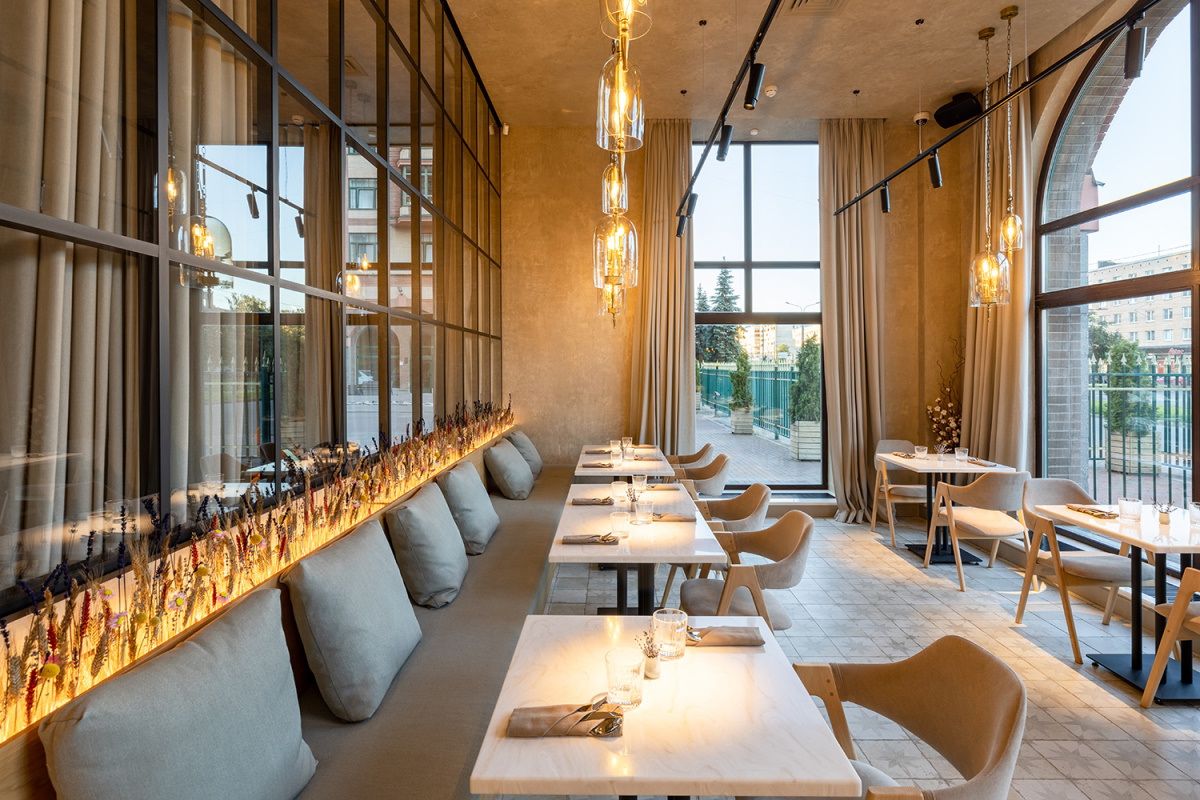 Теплую бежевую палитру интерьера Settlers дополняют натуральные материалы в отделке — лен и дерево. Здесь много воздуха и естественного света за счет высоких арочных окон. На открытой кухне кипит поварская жизнь, а за контактной барной стойкой смешивают коктейли от миксолога Егора Щербакова, который сейчас работает в сочинском баре Simach. Кухню ставила шеф-повар Екатерина Плотникова из московского ресторана Alma: в Settlers обратились к французской классике и блюдам Средиземноморского побережья страны.