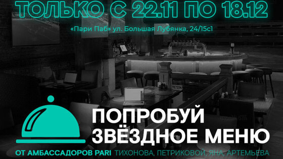 Букмекерская компания PARI и легендарный спортбар Пари Паб представляют специальное «звездное» меню на время Чемпионата мира по футболу 2022. В создании меню участвовали амбассадоры PARI, в том числе известный комментатор Дмитрий Губерниев и экс-футболист московского «Спартака» и сборной России Андрей Тихонов. Амбассадоры PARI лично выбрали свои любимые блюда и объединили их в уникальные сеты, которые можно будет заказать со скидкой 10%. Каждый из них при этом получил название своего амбассадора. Любителям спорта и вкусной еды представлены на выбор следующие позиции: Сет «Победный гол» от Андрея Тихонова, включающий в себя бургер 4 сыра, чесночные гренки и куриные крылышки. «Элегантный сет» от телеведущей Ольги Петриковой, в котором представлены нежнейший тар-тар из лосося и авокадо гриль. «На мороз!» от Дмитрия Губерниева, чтобы согреваться зимой борщом с томлеными щечками, к которому подадут сало, чеснок, сметану и чесночные гренки. «Двоечка» от экс-чемпиона UFC Петра Яна — острый Биг тейсти с халапеньо и картофелем-фри с любым соусом на выбор. «Дроп-гол» от легендарного регбиста Василия Артемьева для поклонников мяса и овощей — стейк топ-блейд и салат из хрустящих баклажанов. «Сет на большую компанию» от ФК «Амкал», он включает в себя куриные крылья, картофель фри, колбаски, жареный сыр моцарелла и чесночные гренки. «После тренировки» от бойца UFC, Армана Царукяна — ребро из мраморной говядины, картофель фри с пармезаном и трюфельным соусом. «Тюлюлин ям» от бойца UFC Дениса Тюлюлина — хорошо всем знакомый суп том ям с креветками и кальмарами. Чемпионат мира — крупнейший футбольный турнир четырехлетия. В 2022 году мировое первенство впервые в истории принимает Катар. Матчи ЧМ-2022 пройдут с 20 ноября по 18 декабря. Титул чемпиона мира в Катаре будет защищать сборная Франции. Спортбар Пари Паб покажет все матчи турнира. При этом PARI проведет просмотры особенно интересных игр вместе со своими амбассадорами и партнерами, среди которых известные спортсмены и лидеры мнений.