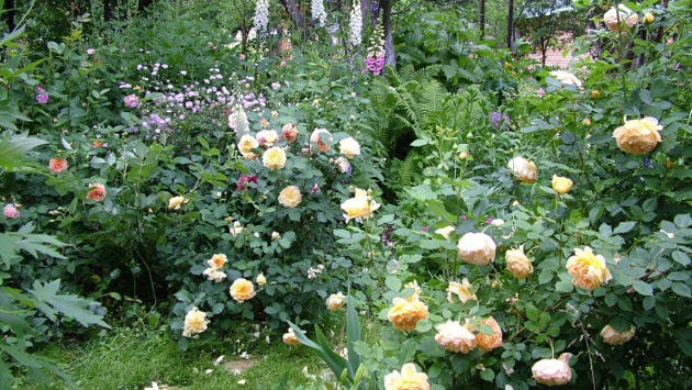 Нужно отметить, что для современных композиций с розами и многолетниками хороши сорта многоцветковых видов (флорибунда, полиантовых, почвопокровных). А цветовая гамма роз может включать, кроме классических расцветок, и сорта с жёлтыми, оранжевыми и лососёвыми цветками.