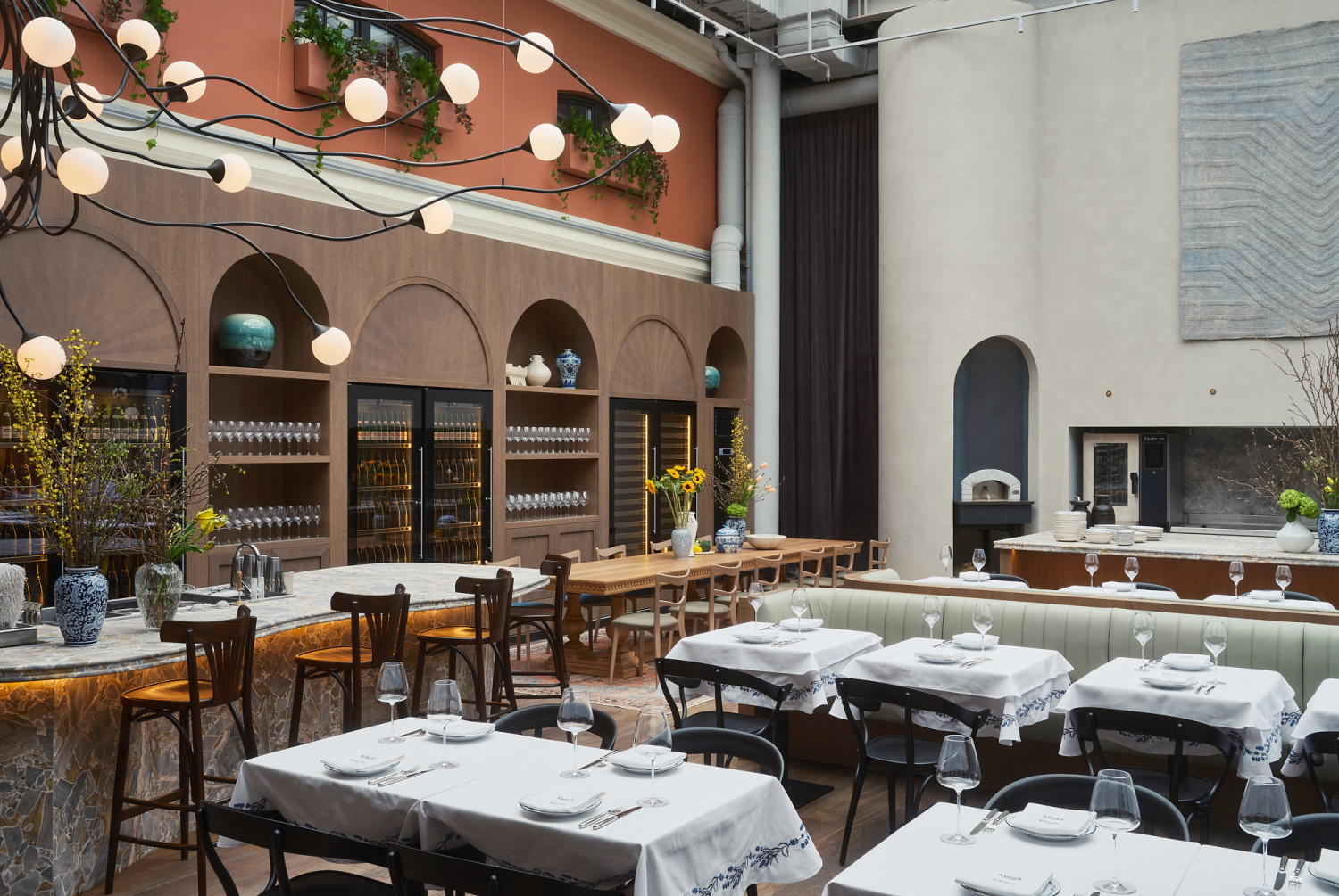 Проект Михаила Соколова и Тимура Дмитриева органично вписался в пространства исторических залов особняка Мясникова 1859 года постройки как эстетически, так и на уровне ощущений. Дизайном интерьера занималась Евгения Ужегова (Eva, Insider, Juan), здесь она стремилась создать атмосферу природного сада, от которого веет теплой дворянской ностальгией.