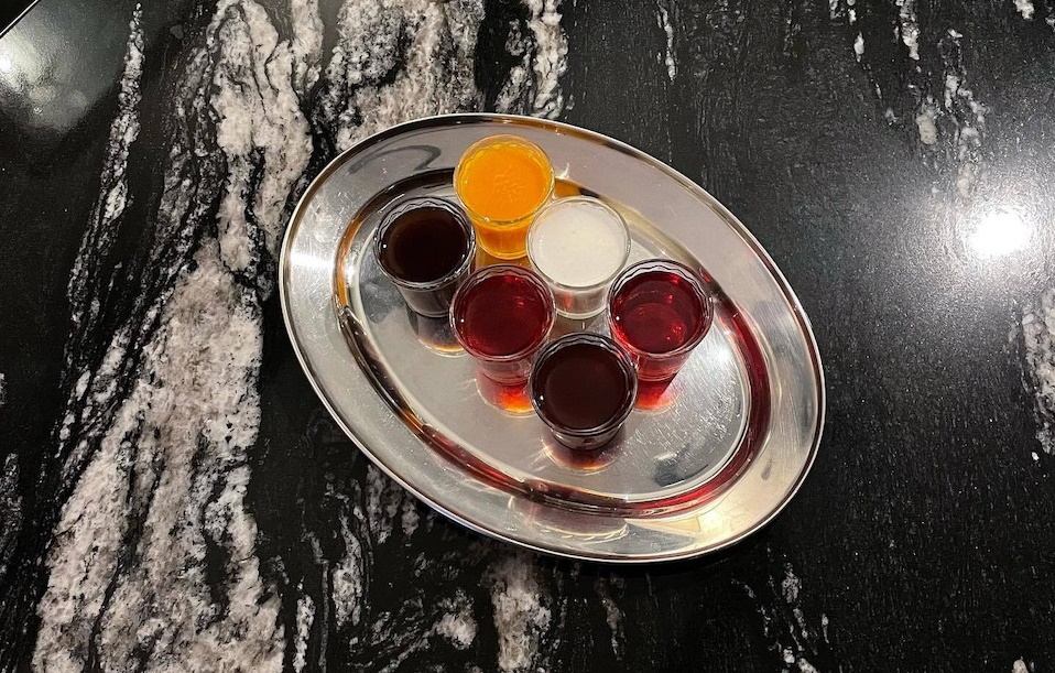 Главная фишка этого атмосферного бара — выдержанные по очень мудреной технологии коктейли (все по 900 р.). Сначала ингредиенты объединяют «на молекулярном уровне» (говорят, с помощью ультразвука), а после отправляют на выдержку от 10 дней в разные емкости: дубовые бочки, бетонные яйца, кожаные бурдюки или стеклянные бутылки. Каждая тара дает свой эффект, и привычная классика меняется. Так, здешний Flower Negroni выдерживают в дубовых бочках, делая его более нежным и цветочным при сохранении баланса горького, крепкого и сладкого. Это для любителей напитков в дубе. Интересно попробовать два коктейля, сделанных по старинной технологии — в бурдюках из козьей шкуры. Получается чуть копченый вкус и мягкость в ощущениях. Хит последних лет — бетонные яйца, которые сохраняют свежесть в миксах, но делают их чуть более комплексным. Было бы интересно посмотреть на все эти процессы, но на полках коктейли хранятся уже разлитыми по бутылкам. Количество порций ограничено. Впрочем, есть и свежие сложносочиненные авторские миксы, и вечная классика. Из чистого — занятные бурбоны, которые продолжают общую тему бара времен сухого закона и бутлегерства. Кухня, пожалуй, самая минималистичная из всех, что мы видели за последнее время. Здесь 7 закусок, от гриссини (80 р.) до самой серьезной — ассорти тапас (240 р.).