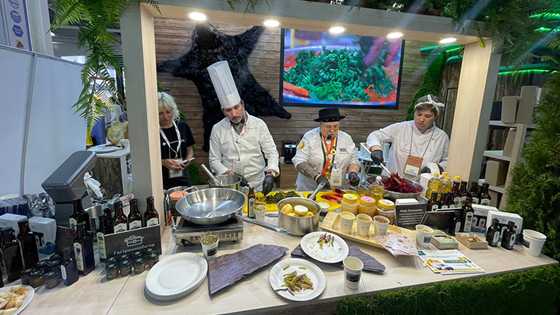 На коллективном стенде, стилизованном под сибирскую тайгу с применением натуральных материалов – дерево, мох, папоротник – представлена продукция, приготовленная по уникальным сибирским рецептам.
