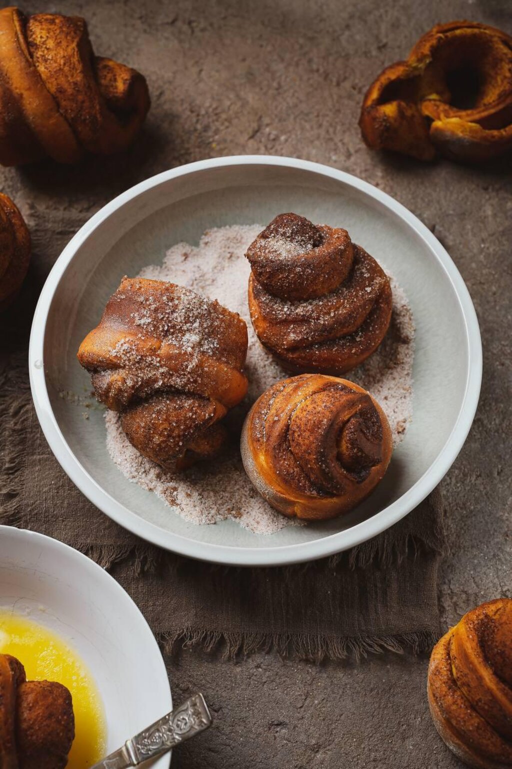 - Окуните булочку в растопленное масло, затем обваляйте в коричном сахаре.