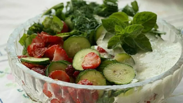 - Смешать в миске кальмары, огурцы, клубнику, зелень. Добавить масло с уксусом и всё перемешать.
