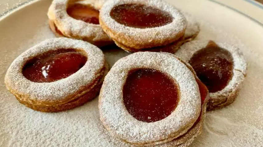 - Вымесить тесто — оно должно быть упругим и не очень липким. Есть два способа, как можно слепить печенье. 1) разделить тесто на примерно одинаковые шарики, примять их и сделать в центре выемку для джема. 2) раскатать тесто, взять стакан и рюмку: предметы должны быть разного диаметра.