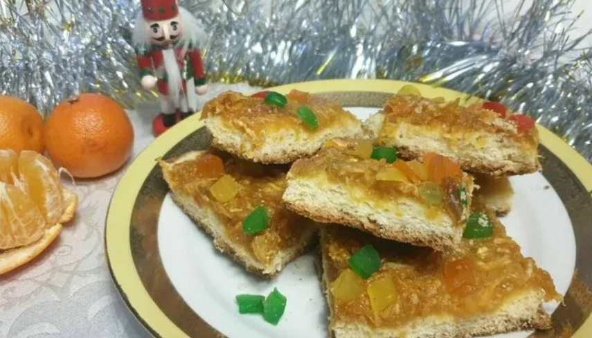 Рецептом поделилась Юлия Анисимова. Этот песочный торт прекрасен тем, что начинка может быть любой — ягодной, яблочной и даже тыквенной, но в Новый год, конечно, уместнее всего мандариновая.