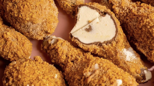 Фантазийный десерт выглядит как поджаренная на сковороде куриная ножка в панировке, однако на самом деле это обыкновенное мороженое.