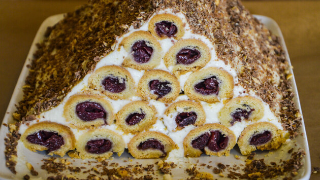Вишню уложить на блин дорожкой и блин свернуть плотным валиком. Затем так же поступить со всеми остальными блинами. Первый ряд блинчиков уложить в продолговатую салатницу. Нижний слой должен состоять из пяти свернутых в трубочку блинов. Их нужно обильно смазать кремом. Затем поверх них уложить слой из четырех блинов. И так далее – пирамидкой, на убывание. Кремом смазывают каждый слой и верх десерта.