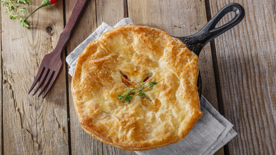 - Тем временем добавьте курицу в соус и подождите, пока мясо не прогреется. Проверьте приправы и разложите куриную смесь по подогретым сервировочным тарелкам. Накройте каждую стопку кружочком теста и подавайте.