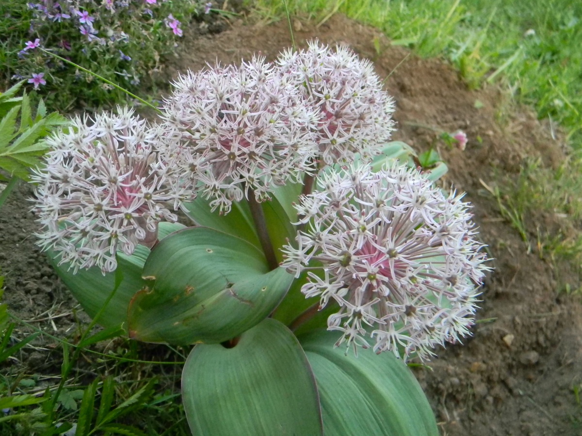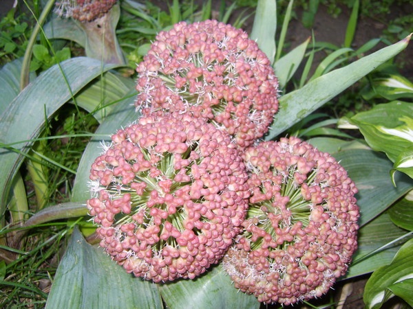 Это один из самых декоративных и своеобразных видов рода. Цветонос сильно заглублен в землю, высота надземной части до 25-30 см. Иногда он приподнимается над распластанными листьями, иногда короче их. Листья широкие (до 20 см), сизо-зеленые с фиолетовой тоненькой полоской по гладкому краю. Цветки светло-розово-фиолетовые, собраны в шаровидное, многоцветковое, густое соцветие .