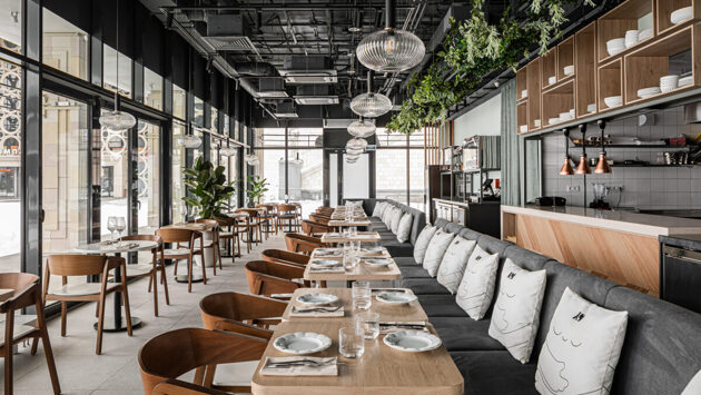 «Лу» — новый герой Лужников. Кафе назвали по первым буквам спортивного комплекса, чтобы сразу было понятно, в каком знаковом месте оно находится. Экстерьер отсылает к архитектуре исторического ансамбля. Простая организация пространства, прямые линии и панорамное остекление как способ впустить больше света и воздуха — приемы заимствованы из 1950-х гг., когда возводилось главное здание комплекса. Интерьер в стиле мид-сенчури. Отсюда стремление стереть границы между внутренней и внешней зоной, большие окна и отсутствие перегородок, много светлого дерева и теплая цветовая палитра. Идея открытости подчеркивает кухня, которая видна отовсюду, и барная стойка, вынесенная в зал. Это создает чувство сопричастности и единения. Яркие детали видны сразу — это и светильники-шары с рельефным стеклом, и ноу-хау в зоне бара — стойка с каменной столешницей, где разливают вино на кранах.