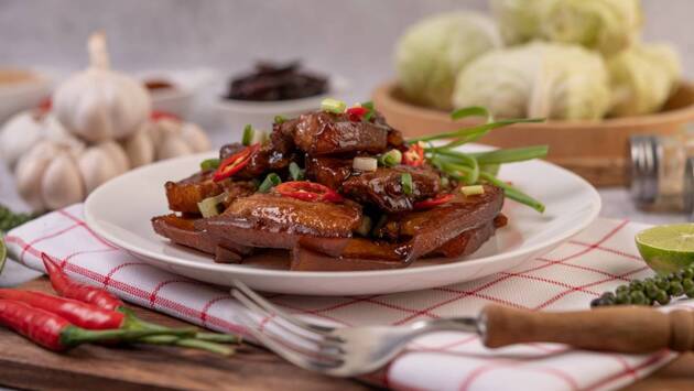 Для того чтобы порадовать гостей и близких сочной свининой в кисло-сладком соусе, понадобятся свиной окорок (600 грамм), 1–2 луковицы, один крупный болгарский перец, небольшой кабачок, небольшой баклажан, растительное масло (150 мл). Для маринада потребуется соль с перцем по вкусу, 1,5 столовые ложки соевого соуса, чайная ложка молотого имбиря. Для заправки — соевый соус (три столовые ложки), 1,5 столовые ложки рисового уксуса, чайная ложка коричневого сахара и три чайные ложки молотого чеснока. Такой набор продуктов обойдется в 860 рублей.