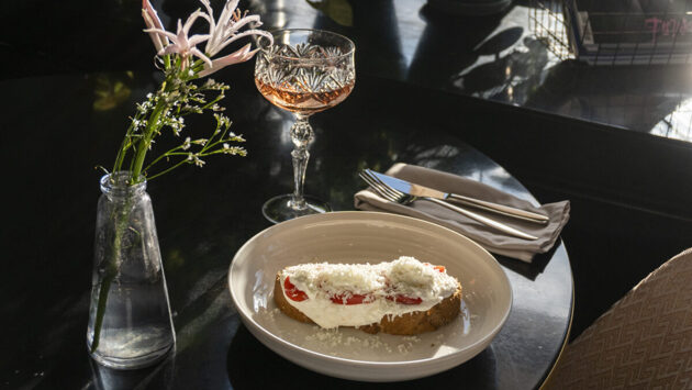 Тост с кремом из топленого молока, страчателлой, томатами и козьим сыром (690 руб.). Изначально Сергея вдохновила перуанская кухня, где довольно популярны соусы из топленого молока. Для гармонизации вкусов шеф выбрал европейские мотивы — страчателлу, томаты и козий сыр.