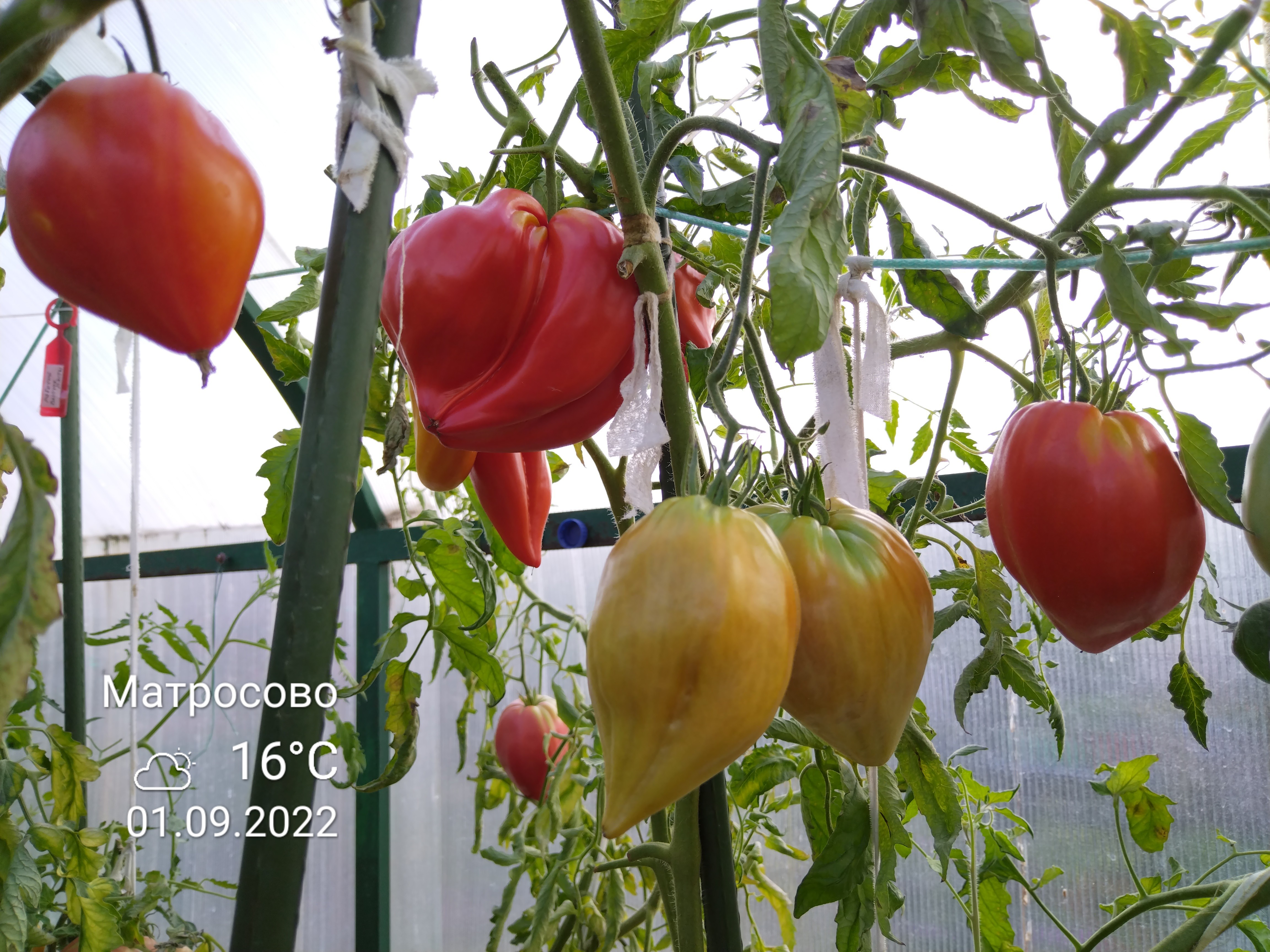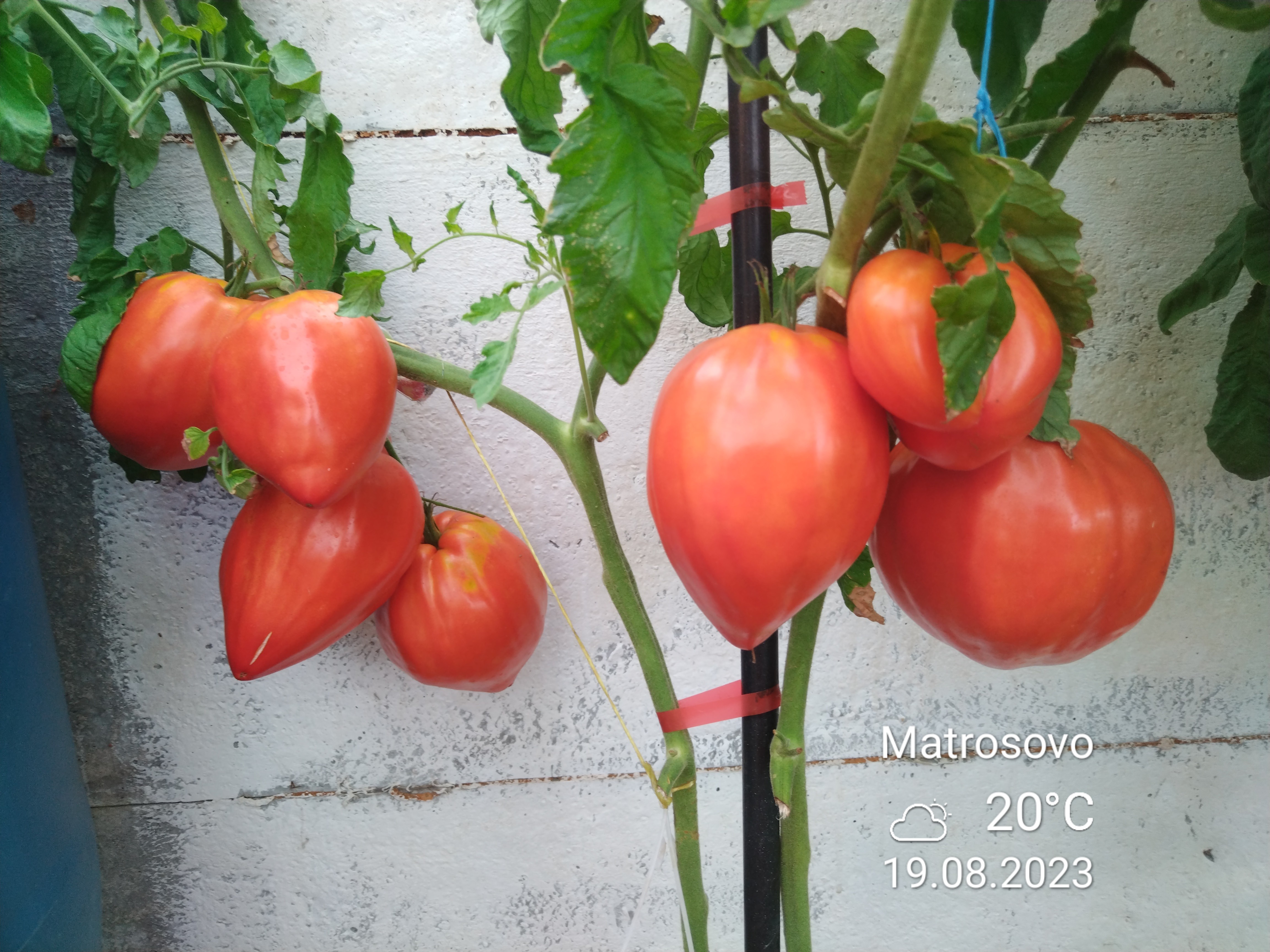 Томат 'Древнее сердце Акви Терме' я веду в два ствола, обязательно удаляю ненужные пасынки. По мере роста подвязываю к опоре (у меня это толстенькие пластиковые колышки). Помидорки завязываются активно. И что интересно для меня — это их разная форма, и классические сердца, и сердца с ребрышками.