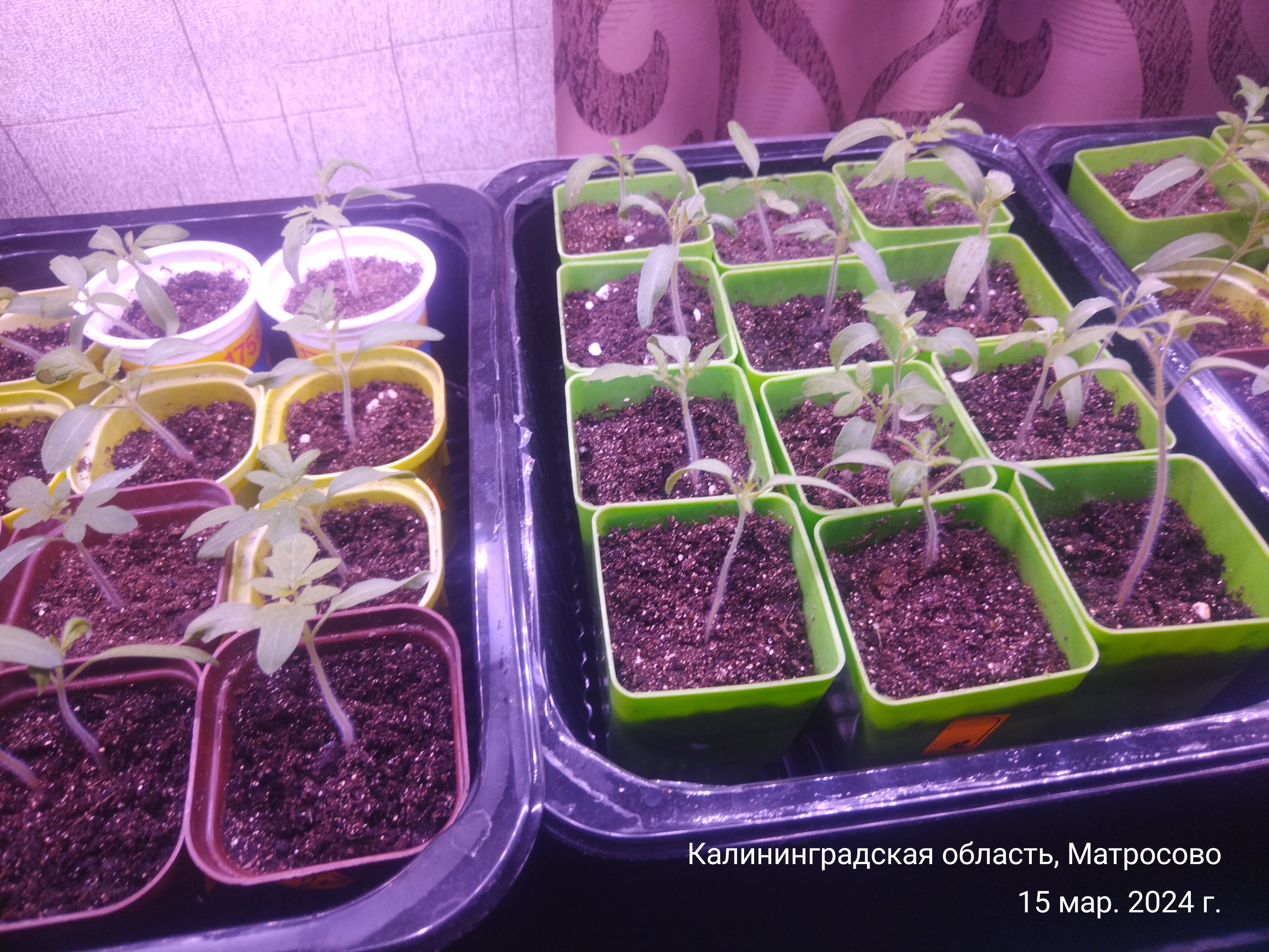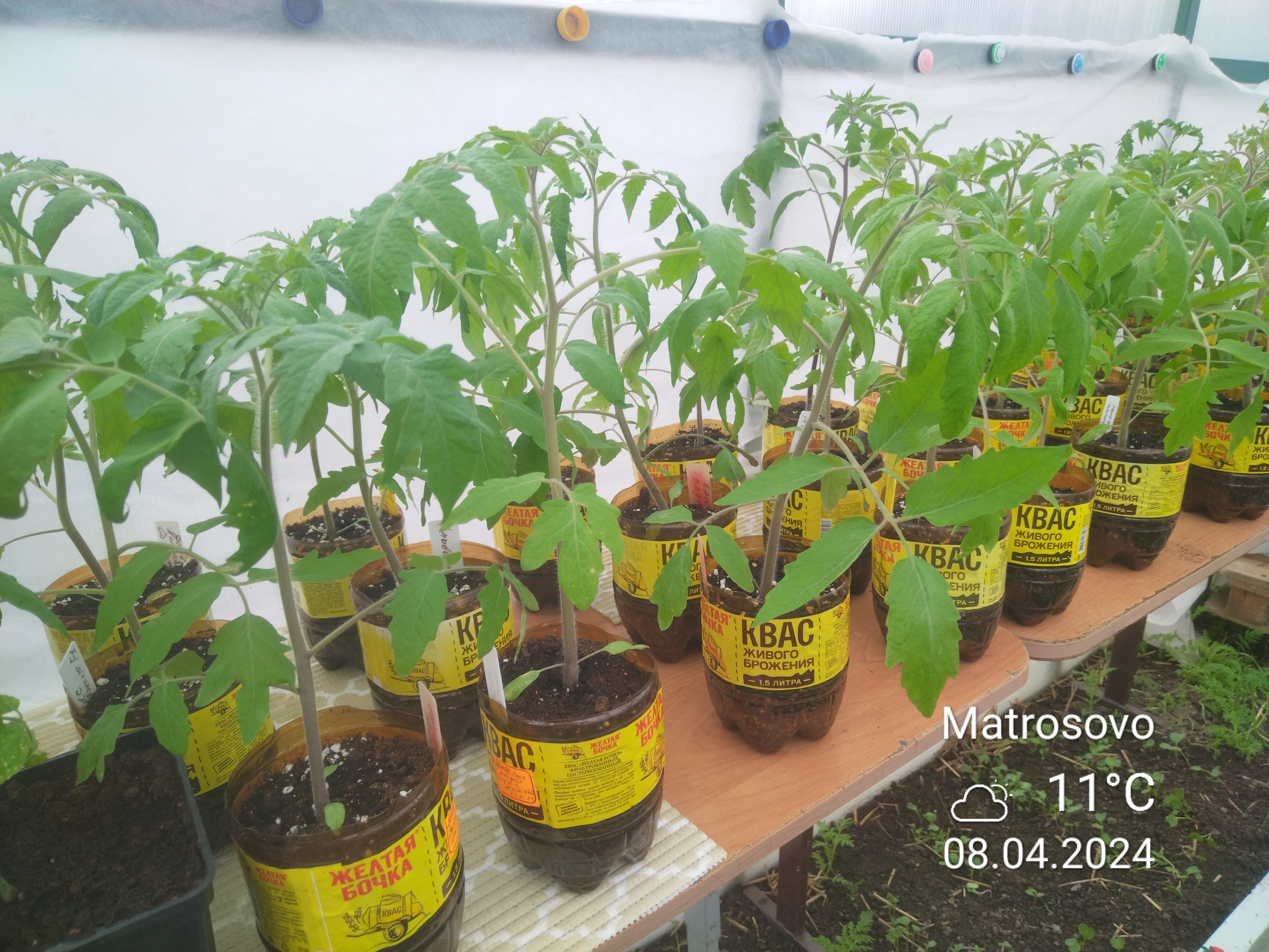 В конце марта переваливаю рассаду помидоров в литровые ёмкости (мне очень нравятся обрезанные бутылки из-под кваса, служат нам с рассадой уже не первый год). А в конце марта или начале апреля рассада переезжает в теплицу для закалки и адаптации к солнышку.
