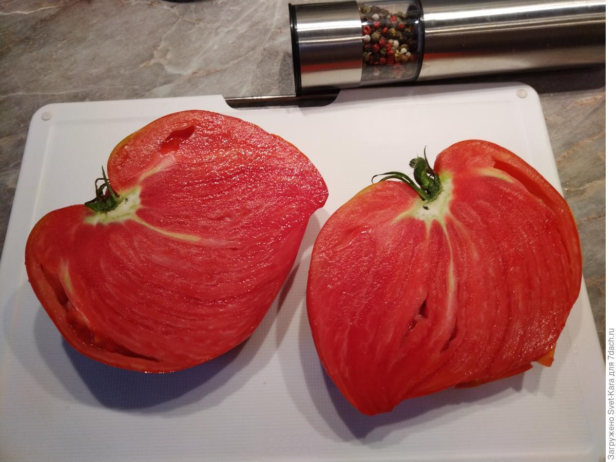 индетерминант, высотой около 2 м;крупноплодный, мякоть плотная, и почти полное отсутствие семян;цвет розово-красный;вес до 1 кг;вкус на 5+ (подходит и для салатов, и для соусов, которые получаются густыми и ароматными).