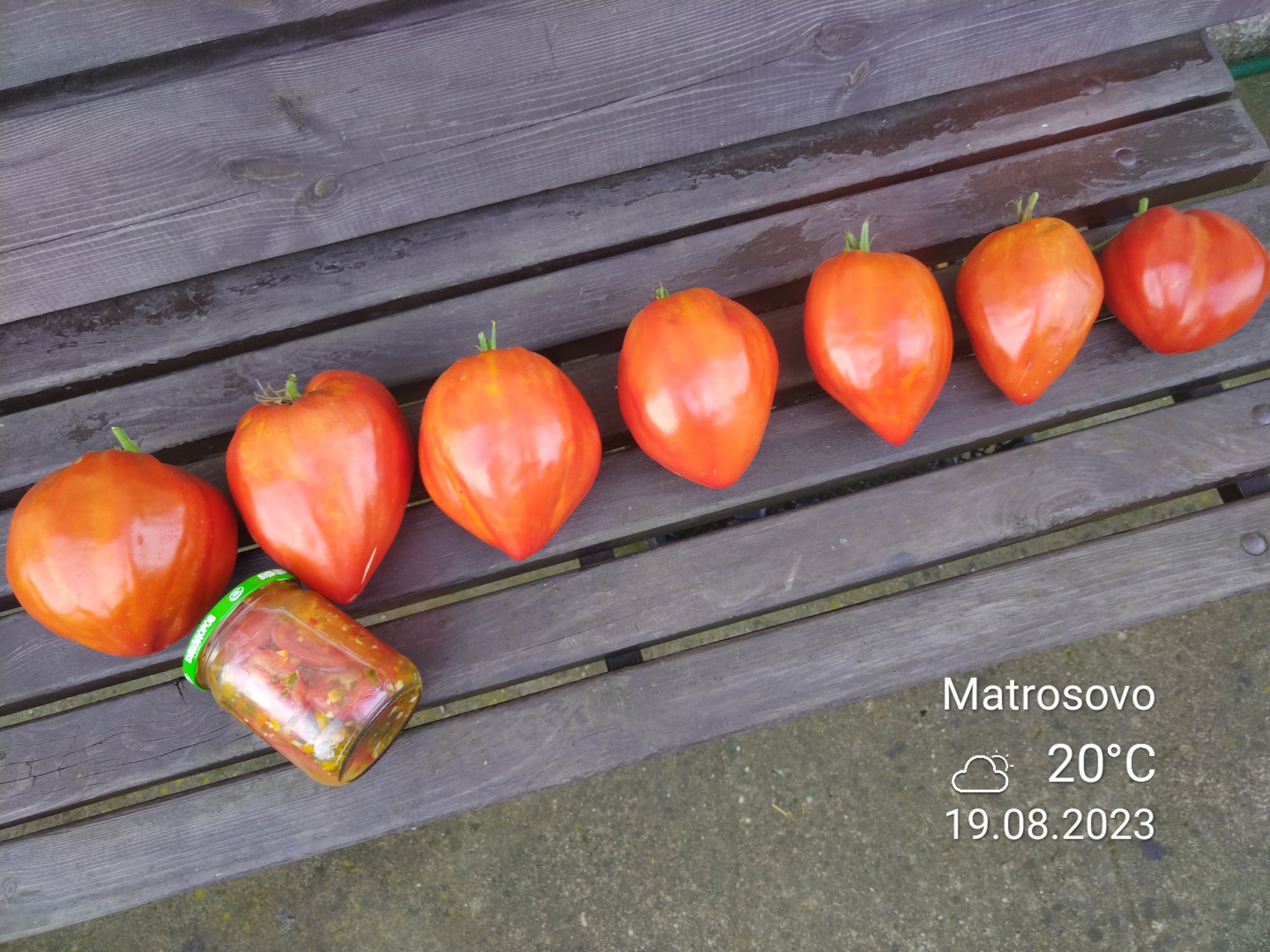 Какое же это удовольствие — за один раз снять с куста 7 братцев-помидорцев. Все как на подбор. Хороши. Баночку на 0,5 литра положила для масштаба.