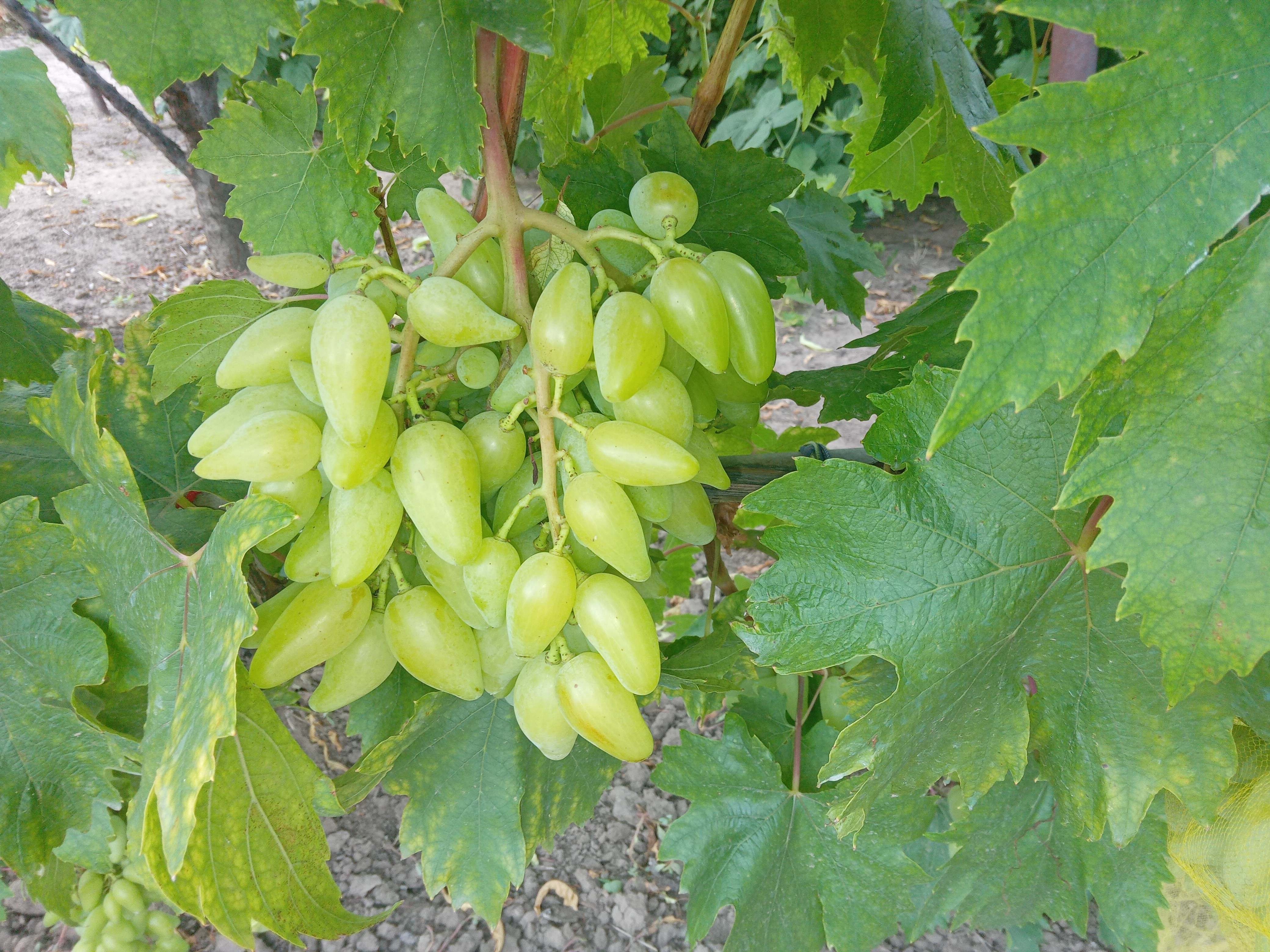 Кусты у этой формы средней силы роста. Плодоношение начинается на 2-3 год после посадки саженца. Грозди средней плотности, конической формы, 600-1000 г. Ягоды этого винограда крупные — 14-16 г, удлиненной формы с заостренным кончиком. Когда кисть полностью созревает, на ягодах появляется янтарный или желто-розовый румянец. Такая кисть очень нарядно смотрится, привлекает внимание и, несомненно, украсит любой стол. Вкус ягод приятный, в меру сладкий. Мускатного аромата нет. Ягоды не трескаются.