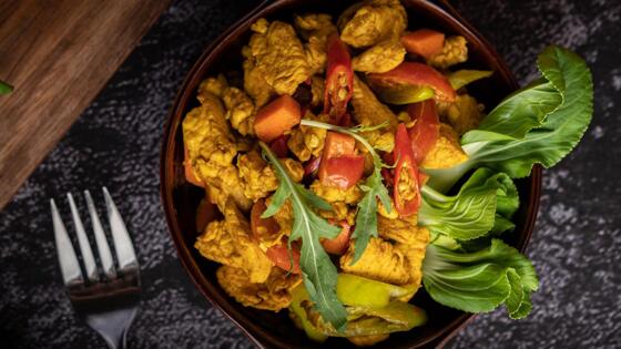 Порошок карри придает сливочному соусу неповторимый вкус и насыщенный цвет, а также хорошо сочетается с курицей, орехами и сухофруктами. К слову, карри — это не какое-то заморское растение, а смесь специй, изначально используемых в индийской кухне и других странах Южной Азии. Конкретный состав современного порошка карри зависит от марки, но обычно это куркума, кориандр, тмин, пажитник, перец чили, семена горчицы, черный перец, имбирь, гвоздика и кардамон.