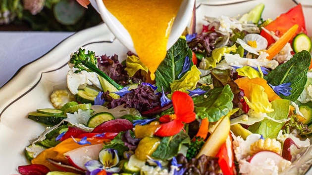 Начать знакомство с новинками можно с Гранд-салата, который вполне способен заменить летний обед. Внушительного размера тарелку с горкой заполняет сочное и хрустящее сочетание салатного микса и сезонных овощей с цитрусовой заправкой и прованскими травами.
